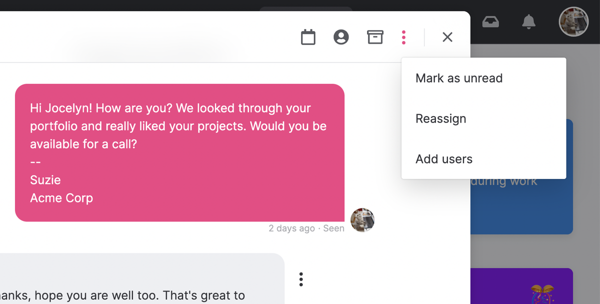 Clicking the three dots lets you mark the conversation as unread, reassign it to someone else in your team, or add users.