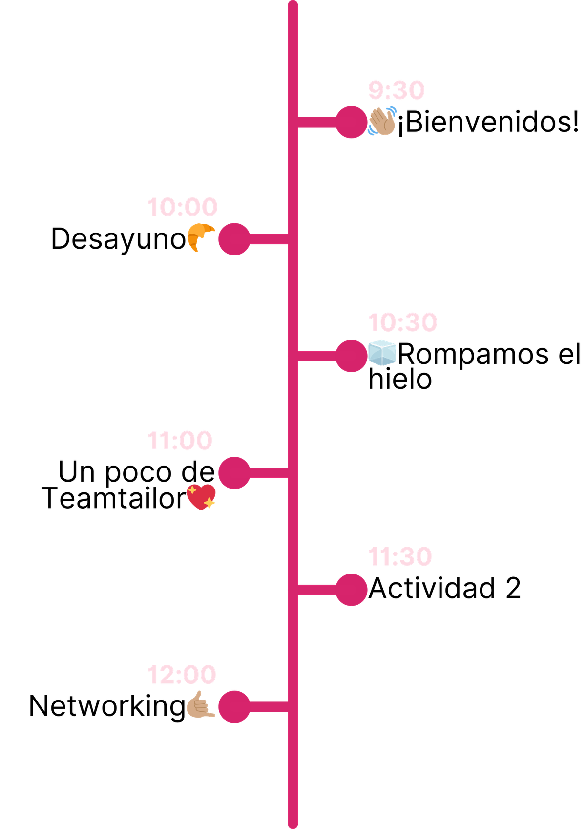 Durante el evento podréis conocer a nuestro equipo directivo además de ver de primera mano las nuevas actulizaciones de Teamtailor. Por supuesto, no faltará un desayuno delicioso y alguna que otra sorpresa que os tenemos preparada😉.