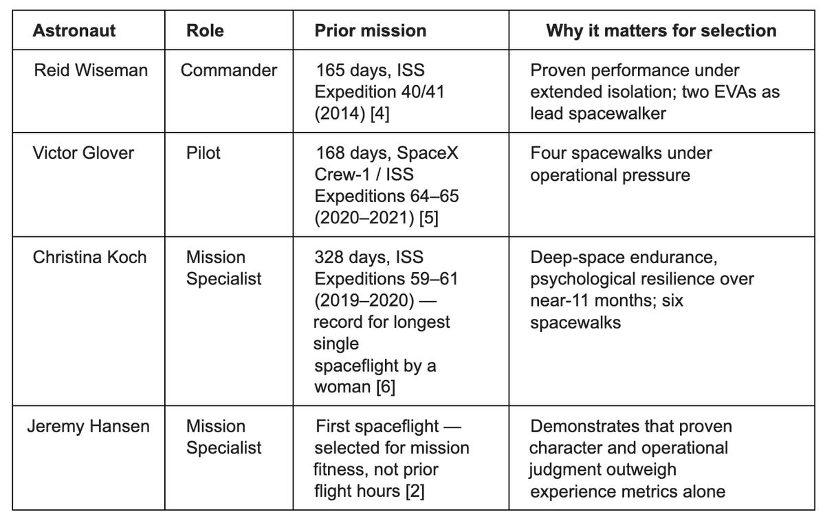 Each member of the Artemis II crew brings a documented track record of functioning under real pressure: