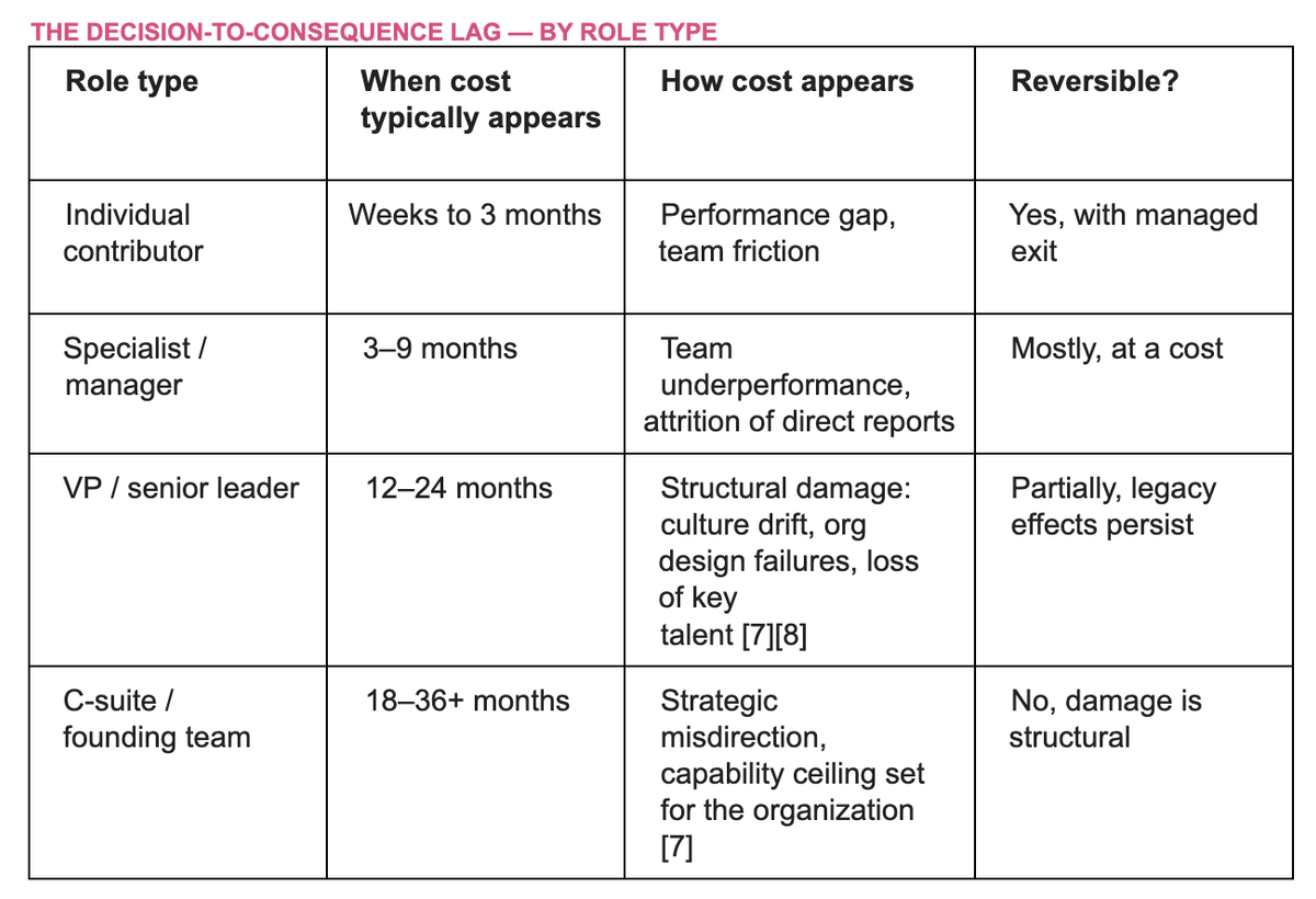 The answer to this question, mapped across a company's open roles, immediately reveals which decisions require disproportionate care and which can tolerate more speed. It identifies the roles where the gap between decision and consequence is long enough that the company will be deep into the damage before the error is identifiable.