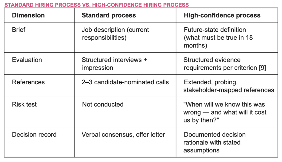 High-confidence hiring for structurally consequential roles typically requires elements that standard processes omit: