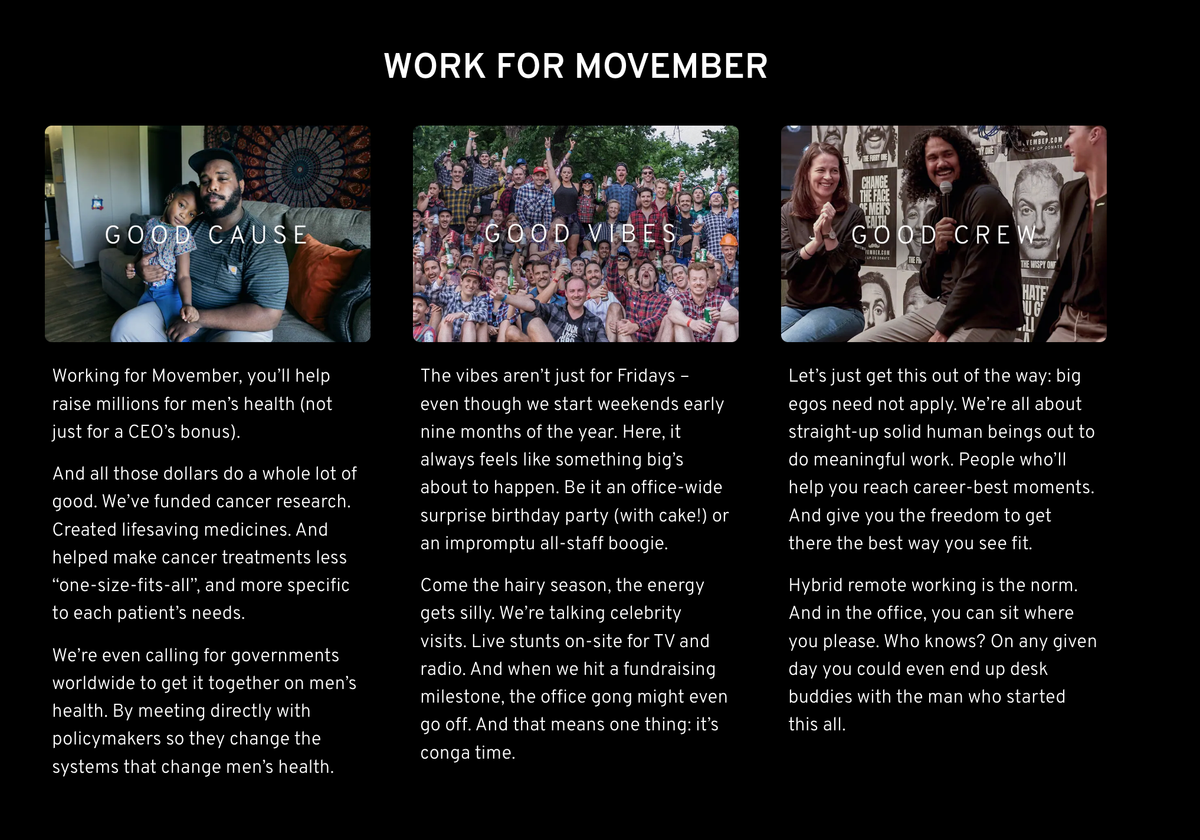 Edan quickly discovered that almost every Movember employee had a deep personal connection to the cause. Stories of fathers, brothers, or friends impacted by men’s health challenges. So Edan set about bringing together an Employee Value Proposition (EVP) and redefining their employer brand to something that brought to life their three core values: Good Cause, Good Vibes and Good Crew. It was important that candidates felt this from the very first interaction.