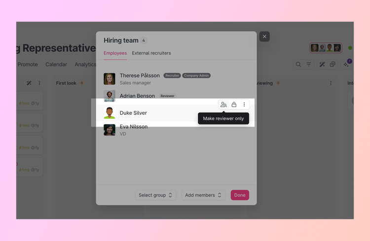 We've made it possible to add users as Reviewers to a Hiring team. This is super useful for situations where you want users to be included in the process, but only as reviewers, and not for them to be involved in managing the process or communicating with candidates.