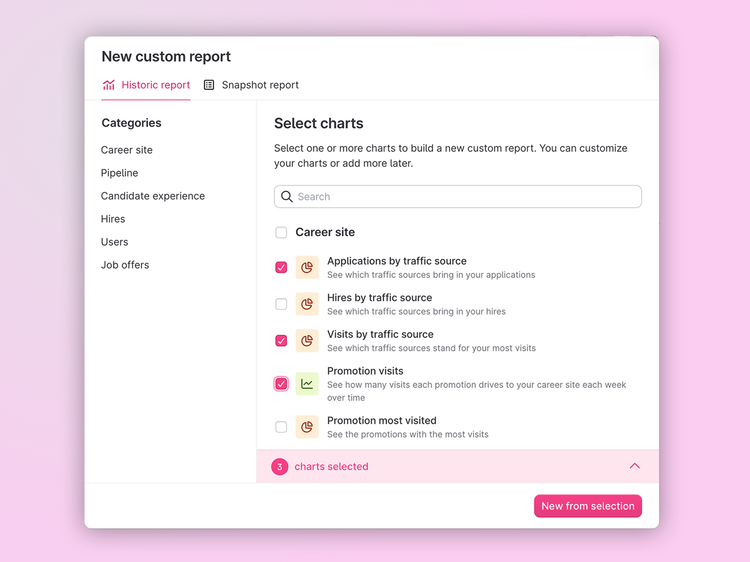 Pick your charts to create custom reports 📊 Brand new filters have also been added to the overview and standard reports.