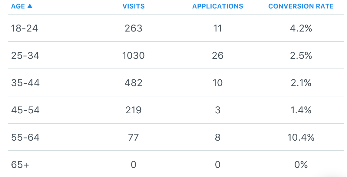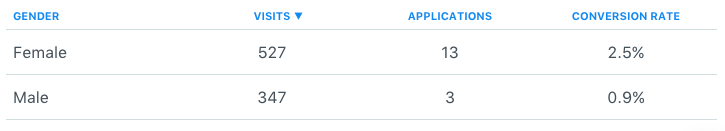 Get statistics of your visitors' gender and age. You'll also get full insights of who you are converting to applicants.