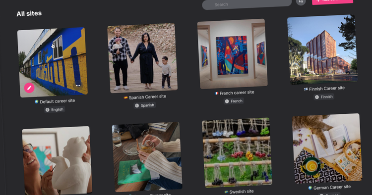 Your Content section has now gotten a new view, where you will see all of your career sites. To add a new site in a new language, click Add career site in the top right corner. When adding a new career site, you can either clone an existing site or create a blank site. This means that you can always choose to either translate the existing blocks or choose to create your new career site from scratch.