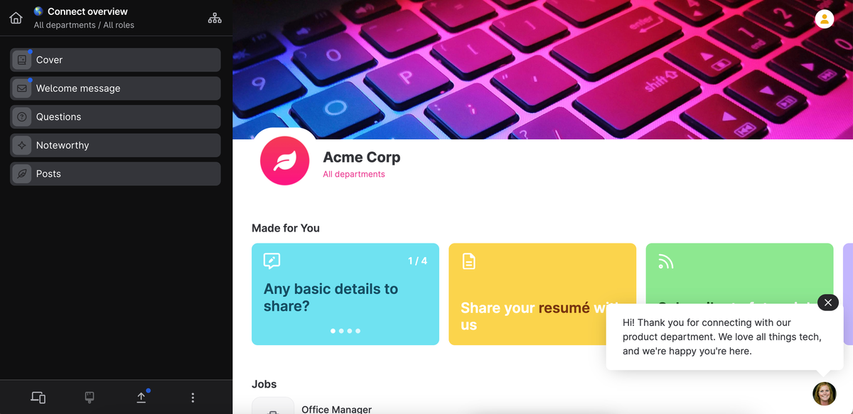 As candidates connect with you, they choose which department and role they are most interested in. You can now make sure to greet them with a personalised experience that lets them get to know you and your team. Ask questions specific for the department, show content that relates to their interest and make it easy to get to know you more.
