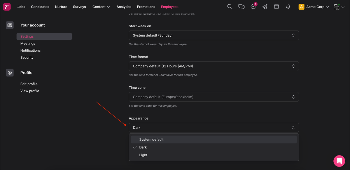 Choose between dark, light or your system default in Your account —> Settings. System default means that Teamtailor will automatically adapt to your device settings, meaning turn dark after a certain time in the evening for example.