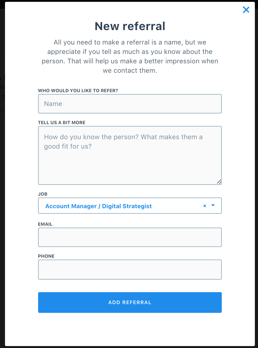 In their Employee Dashboards, your employees will have the opportunities to recommend people in their network smoothly. When they recommend others, they'll get to state how they know that person and why they think he/she will be a good fit for your company. After they recommended that person, they can see which status the candidate has. They can only see if the candidate is in inbox, in process or hired. They can not see any more information about the recruiting process.