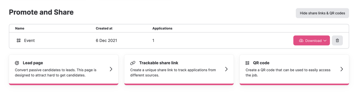 Check out your results by expanding the list of share links and QR codes, and see how many applications your QR code has generated. Keep track of which posters and codes have generated the most applications to your jobs.
