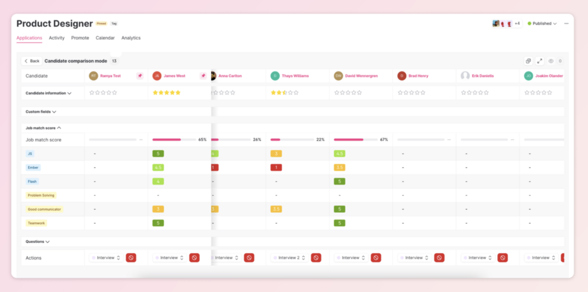 Assess, sort, and compare candidates based on different parameters in this new candidate comparison tool. You can pin and hide candidates in this view to make it easier to scan the candidates. Simply go to a job, select the candidates you want to compare using bulk select and click on the compare icon in the toolbar.
