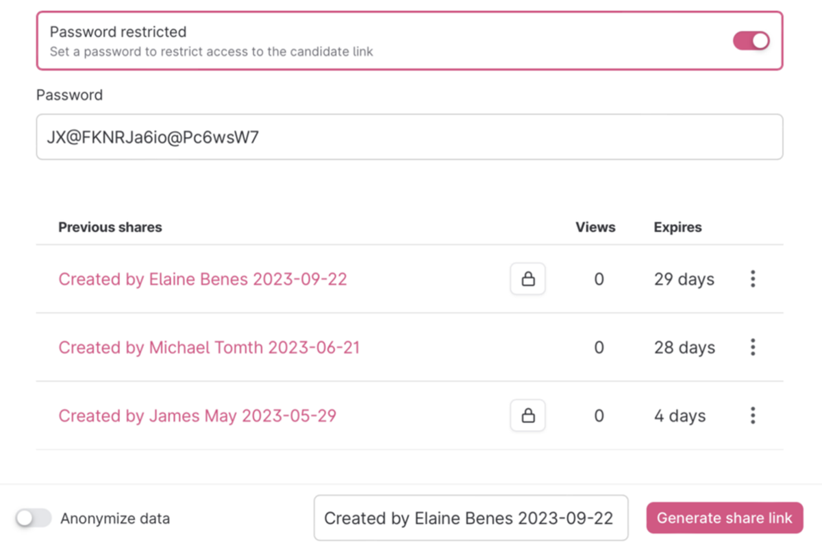 Sharing candidate profiles with others is a great way to involve more people outside of the hiring team in the recruitment process. You can now add a password to those links, restricting access and having full control of who can view that candidate profile.