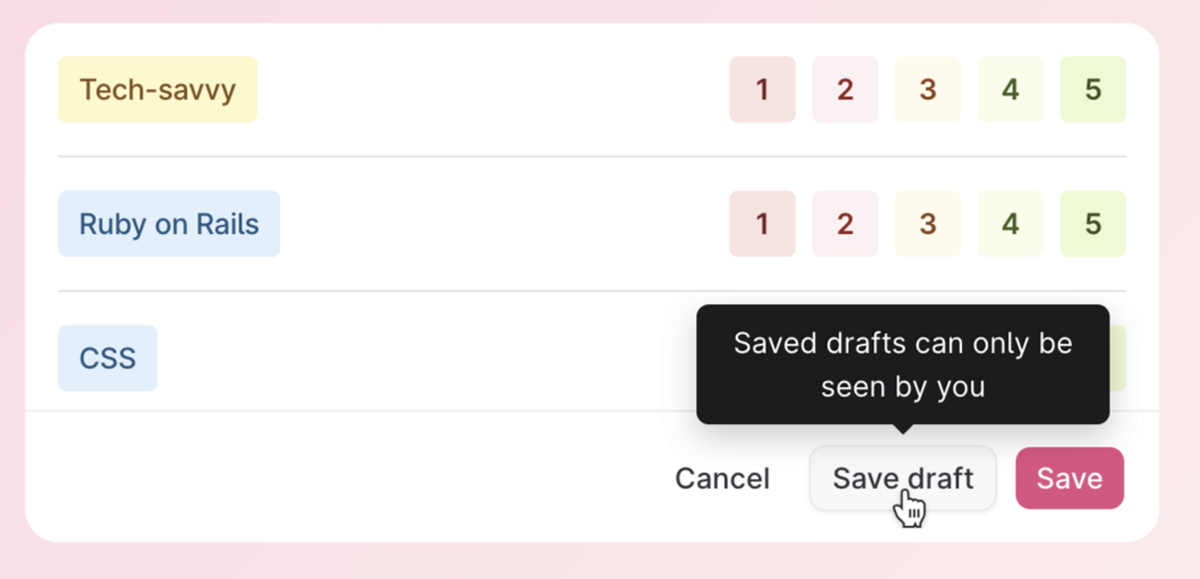 Save your interview feedback as a draft when filling out the information. You can also continue to work on that interview feedback later from any computer. In the list of interviews you will see a small badge that indicates that the interview is saved as a draft.