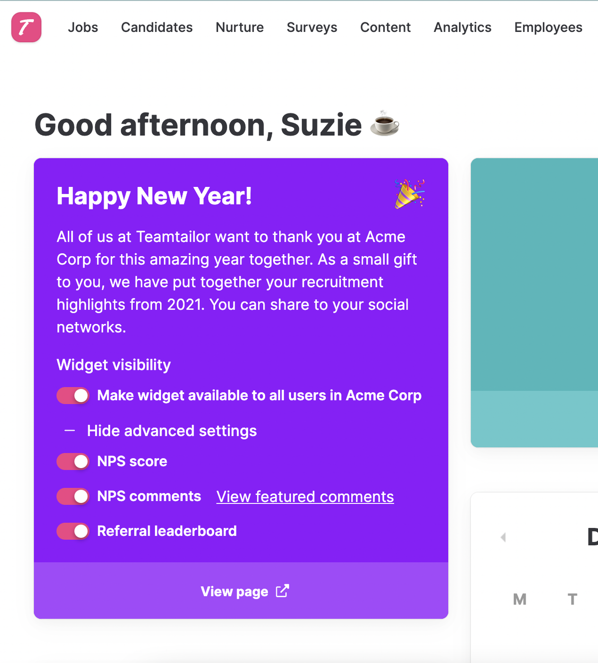 You have a new widget from us at Teamtailor on your dashboard. You only need to click on Generate page for it to be created — it's as easy as that! You can also choose if all users in your account should see it. If toggled off, only admins will see it.