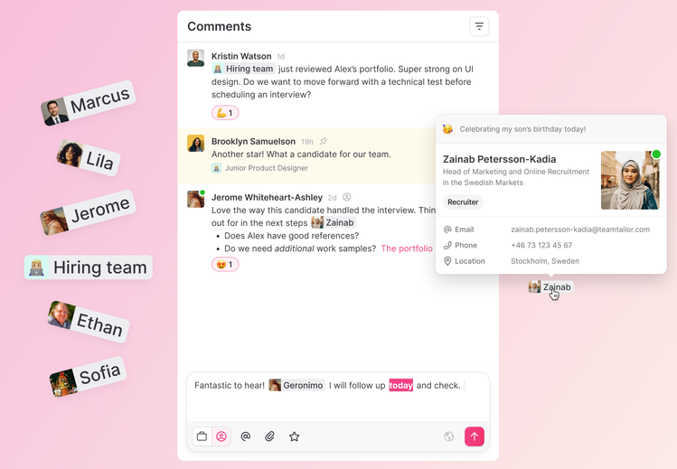 We’ve also added bold, italic, links and · lists to comments to let you express yourself and keep discussions structured and easy to follow. Finding the right colleague to loop in has become effortless too. The new dropdown for team members shows roles and permissions at a glance, and when you need a wider audience you can tag the whole hiring team or assigned group in one go.