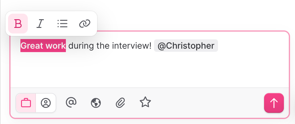 We’ve also added bold, italic, links and · lists to comments to let you express yourself and keep discussions structured and easy to follow. Finding the right colleague to loop in has become effortless too. The new dropdown for team members shows roles and permissions at a glance, and when you need a wider audience you can tag the whole hiring team or assigned group in one go.