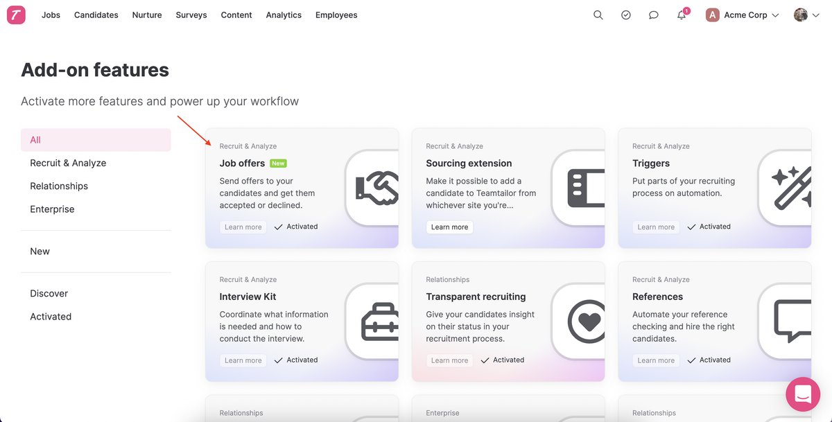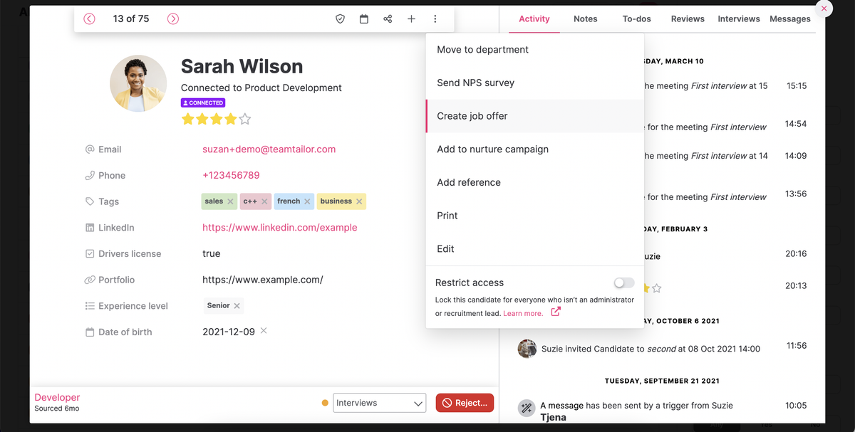 We're thrilled to announce Job offers 🥳 This smart feature lets you and your team collaborate to make an offer to your candidate, send it to them to review and submit their answer. Work efficiently and keep all important pieces of the recruitment process in Teamtailor.