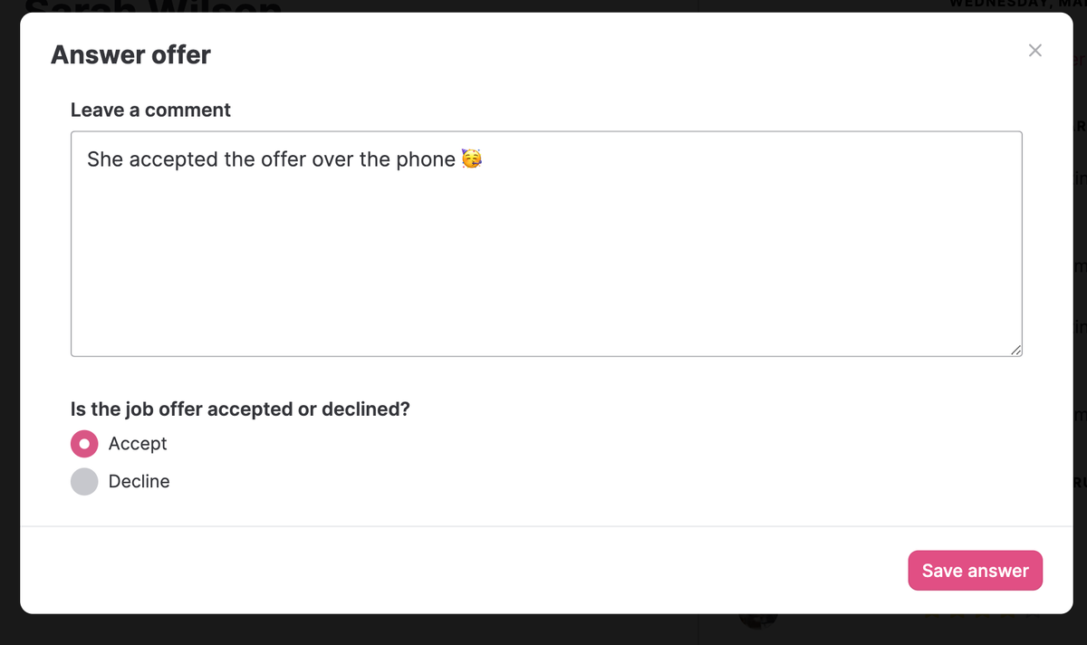You can also accept or decline the offer manually if you ever need to. Leave a comment saying why this is done and what the candidate has answered. This will be shown as an activity in the candidate card.