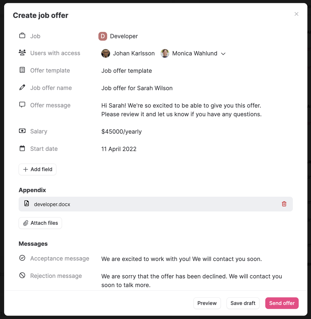 Create a job offer by using a template or create it from scratch. Add fields with information you want to include, attach documents and write your message. In the "Users with access" section, you can select which users should have access to see this offer.