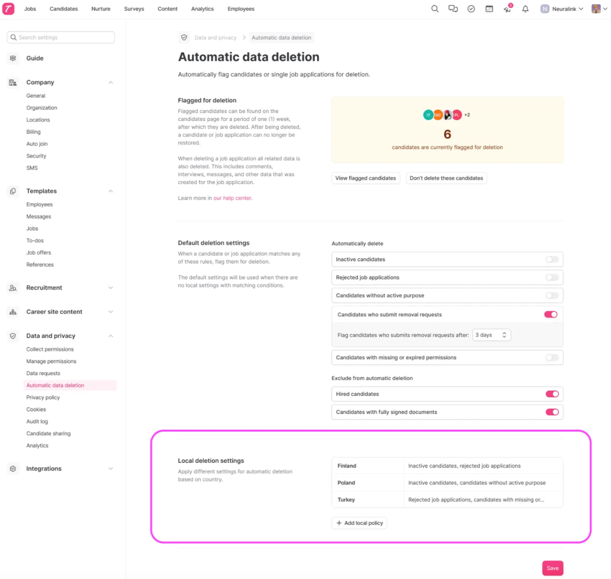 Teamtailor’s feature for automatic deletion based on different parameters also works with these new local settings. Set your rules for how the automatic data deletion should work for candidates in different locations.