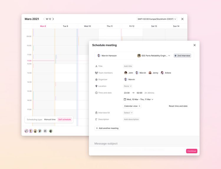 Book a series of meetings for one or multiple candidates in one go. With this new feature, you can set up the meeting flow just as you want it. Select if the candidate should be able to self-schedule or give them a set time. Just click "Add another meeting" in the booking form to set the details for the meetings.