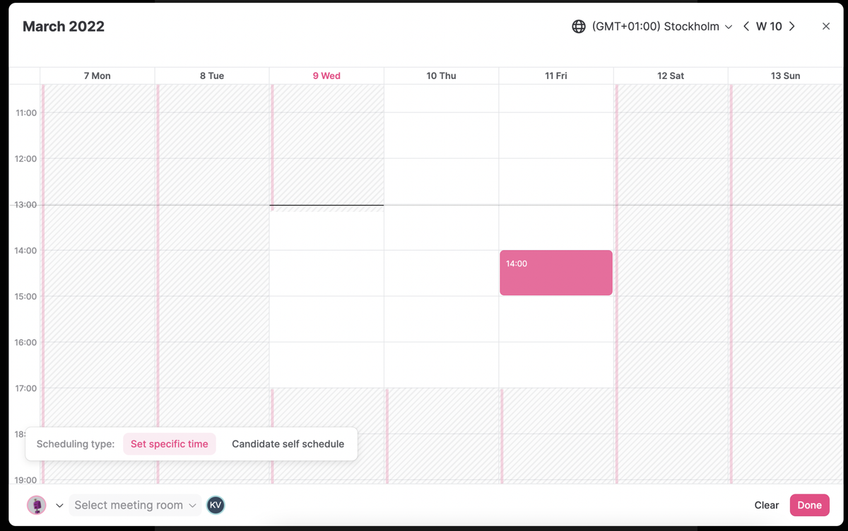 With our smart schedule functionality, candidates can book their own meeting by selecting from time slots where you are available. Before creating a meeting you will now get a preview of how many time slots that the candidate can choose from.