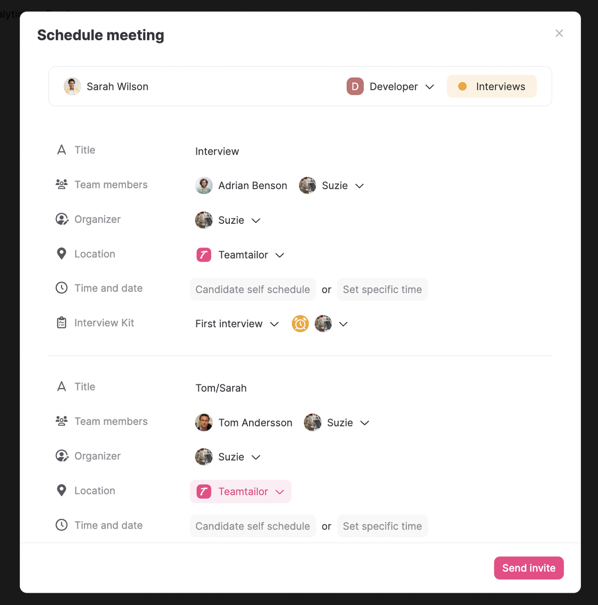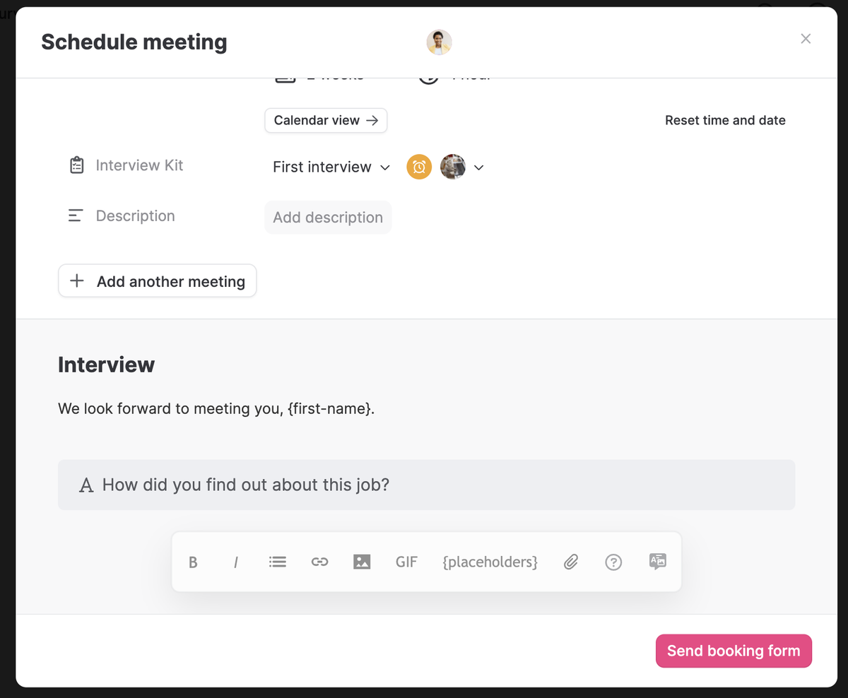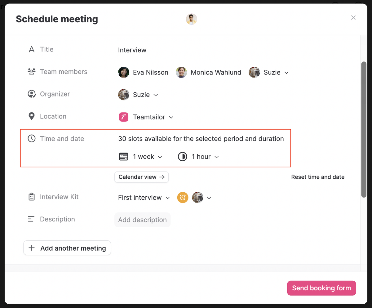 Book a series of meetings for one or multiple candidates in one go. With this new feature, you can set up the meeting flow just as you want it. Select if the candidate should be able to self-schedule or give them a set time. Just click "Add another meeting" in the booking form to set the details for the meetings.