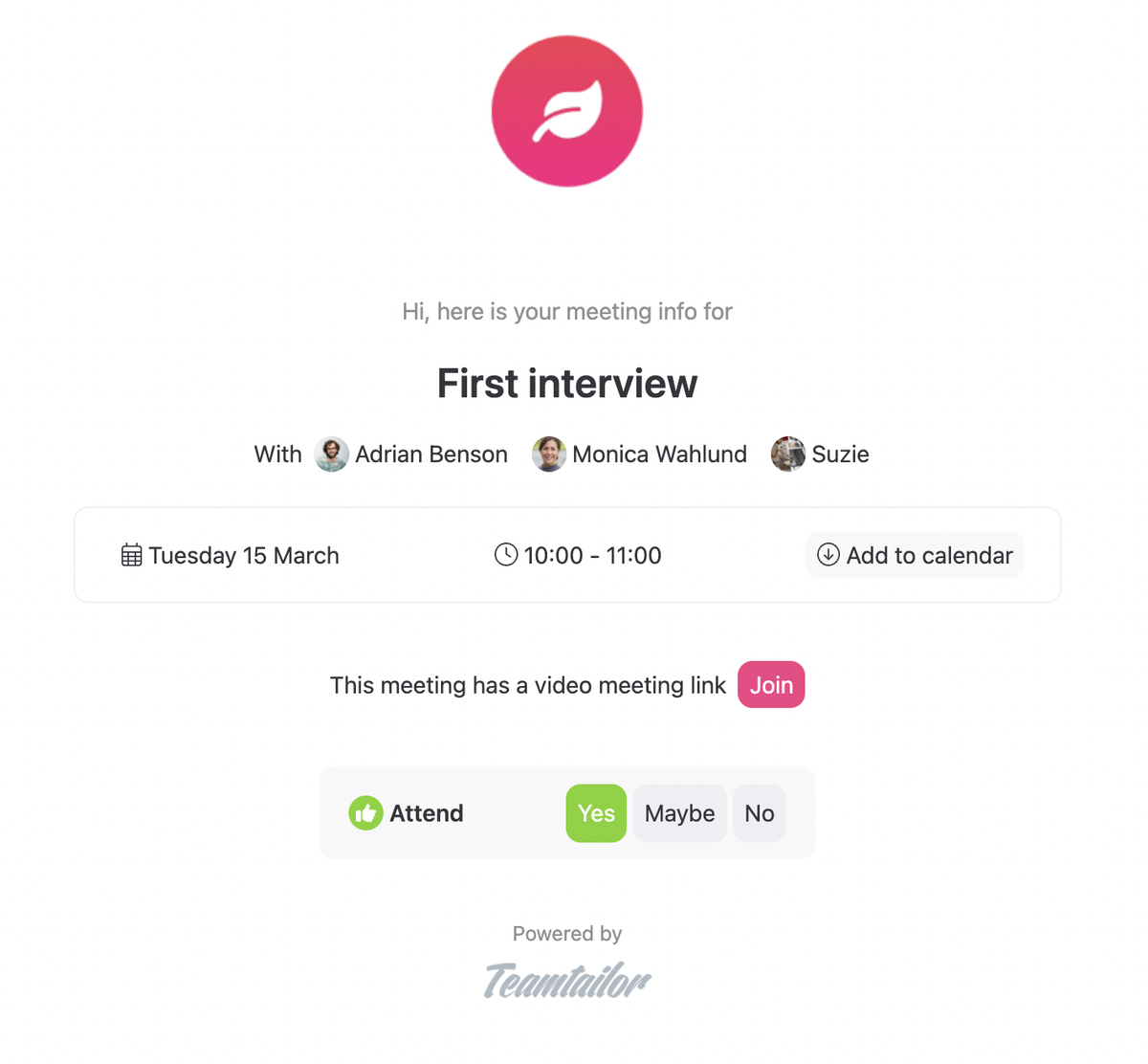 We're further improving the candidate experience by giving the candidate access to all relevant information in one place. With this page, they'll see all information about their meeting and be able to change their answer if they need to.