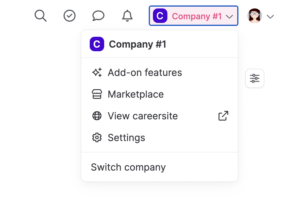 You'll now see all things related to the company when clicking the company name in the top right corner. Add-on features, Marketplace and Settings. If you have logins to several accounts, you can also switch the company account here.