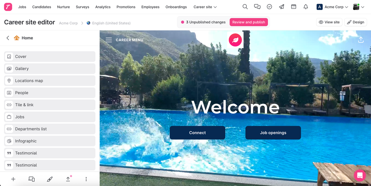 You're now taken straight to the editor, where you can instantly preview and update your career site. The new editor shows you how the page is structured and allows you to make changes right away.