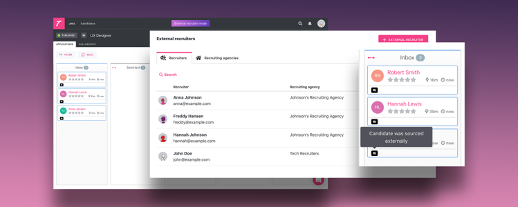 Candidates that are added by other external recruiters, sourced by employees, or applied, will not be visible to the external recruiter. This way you can collaborate with several external recruiters in the same job process, without showing any information you don't want to share.