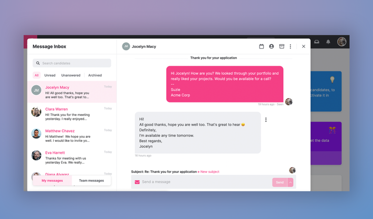 Toggle between messages and answer one or several candidates without any extra clicks. You'll find the new Message Inbox in the top right corner, next to the notification bell.