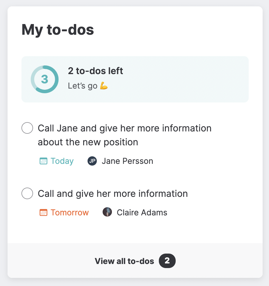 Add tasks reminding you to post a job, book meetings or post new photos on your career site. You can add tasks that remind you about anything. Previously you've been able to add tasks to candidates to make sure that nothing is forgotten when it comes to the candidate's experience. With this new update you get an improved to-do feature that makes it possible for you to work more efficiently in Teamtailor.
