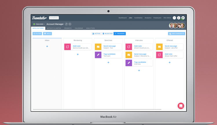 You can now add specific triggers on a stage in your recruiting process, like sending and email or adding a tag. When a candidate is moved to that stage, the trigger will be activated. This way you'll be able to set up your triggers one time, and then let everything happen automatically. Set up your recruiting process just the way you want them, and get full control over your stages.