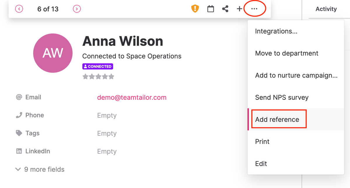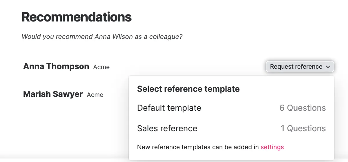 Candidates add their references as they apply or connect. After the reference has chosen to either recommend or not recommend the candidate as a future colleague, you can send them the reference form, where you can ask any questions you like. You can also add other references manually through the candidate card, and send the questions directly to them.