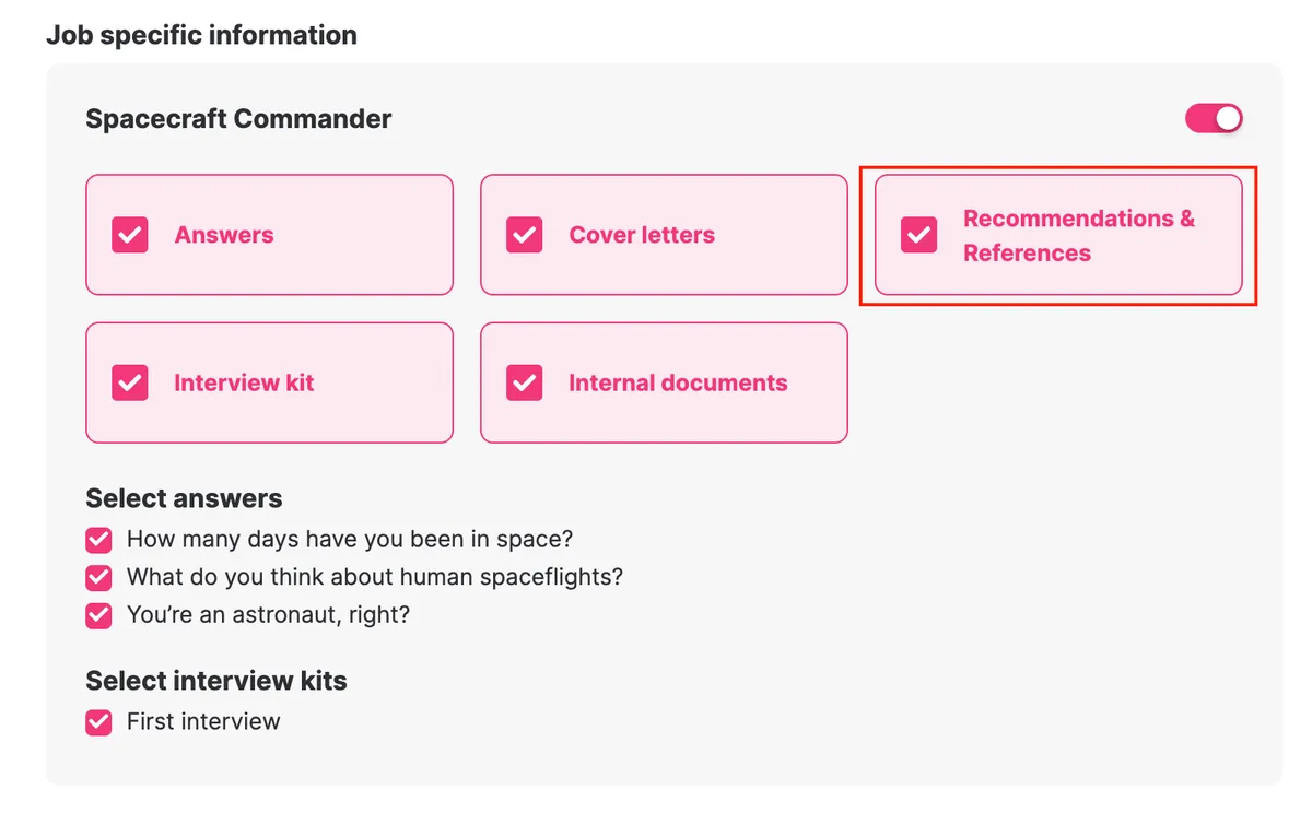 Candidates add their references as they apply or connect. After the reference has chosen to either recommend or not recommend the candidate as a future colleague, you can send them the reference form, where you can ask any questions you like. You can also add other references manually through the candidate card, and send the questions directly to them.
