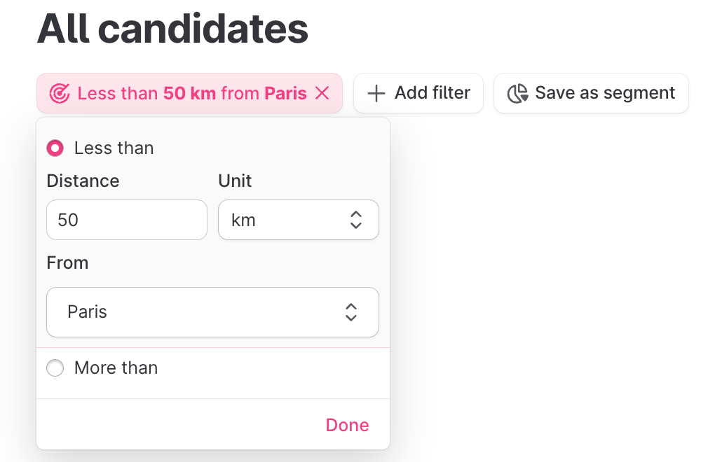 There's now a new filter on the Candidates page. Filter candidates based on their distance from a selected company location. Simply choose whether you want to see people "less than" or "more than" a certain distance away. In the Job view, you can filter candidates by their distance from either a specific job location or any job location associated with that role.