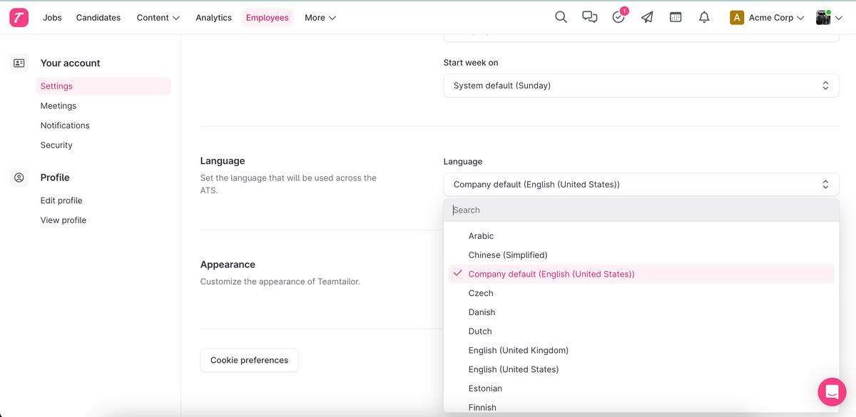 Teamtailor users can use the platform internally in 32 different languages or language variations. This truly makes using Teamtailor a great experience for all your teammates across the world 🌍