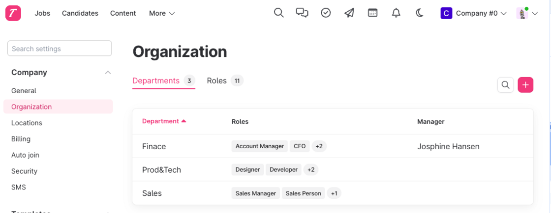 We've moved the departments and roles settings into Settings > Company > Organization. From there you can maintain your company organization with a more clear visual way.