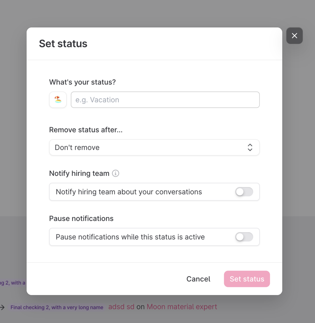 Let your colleagues know your current status with messages like "On vacation" or "Childcare". You can also pause notifications and notify other members of your hiring team when you receive a message from a candidate. This ensures your candidates aren't left in the dark when you're away.