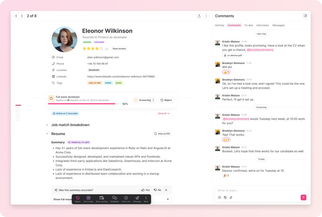 With Teamtailor's video meeting service, Co-pilot now provides summaries that better highlight the candidate's responses, offering clearer insights. Read more about the feature here.