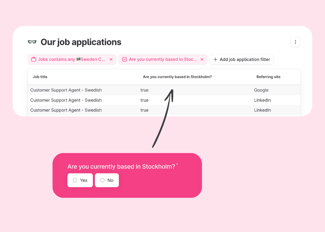 Improve candidate and recruiter experience by adding questions that require a yes as answer for the candidate to complete the application. A qualifying question is a yes/no question that the candidate has to answer per your recruitment criteria to be able to even fill out the rest of the application form. If the candidate answers the question in an ”unqualified way”, they will receive an immediate message that they don’t meet the job’s requirements.