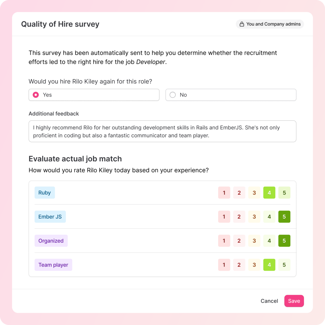 Each time you move a candidate to the Hired stage, a Quality of Hire survey will be sent after the selected evaluation period. The survey recipient gets an email and answer this question: Would you hire [name] again for this role?