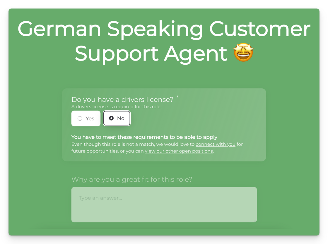 Until the candidate answers Yes to the question, they will not be able to fill in the rest of the form. That way you ensure that none of the candidate’s time was wasted!