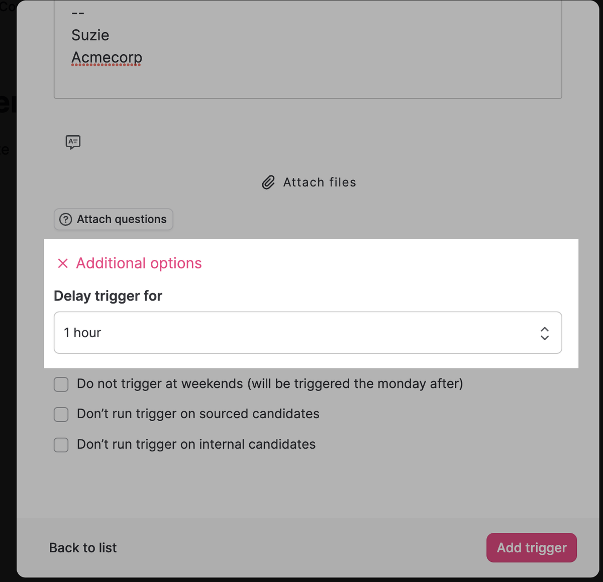 As you're adding a new trigger to a stage, click Additional options. You'll be able to select a range of different time intervals, or choose to set up it yourself with the custom time option. This will delay the trigger from running for the selected time after the candidate's been moved to that stage.