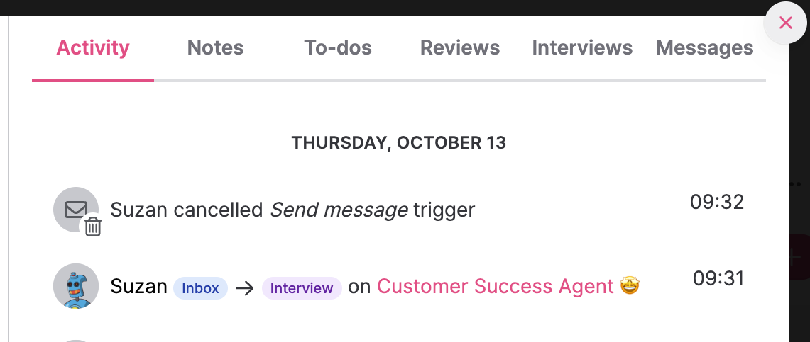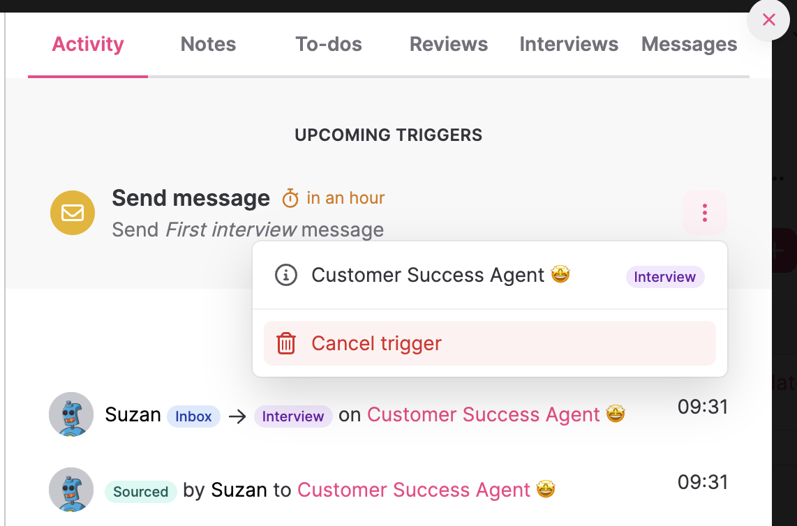 Sometimes a trigger that has been set up before might not suit the situation anymore. You might have given the information in a call and don't feel the need to send it over in a message anymore. With this new update, you'll be able to cancel any upcoming triggers for a candidate. Click the three dots next to the trigger and cancel the trigger.