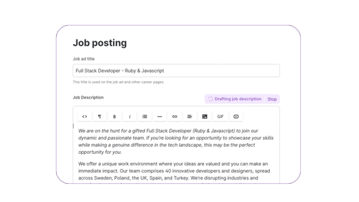 Crie anúncios de vaga estruturados com facilidade e distribua-os instantaneamente em sites de carreira e páginas internas de oportunidades. Basta adicionar o título da vaga e o nosso Co-piloto de IA ajudará a preencher a descrição. Você também pode adicionar perguntas personalizadas para aprimorar a experiência do candidato.