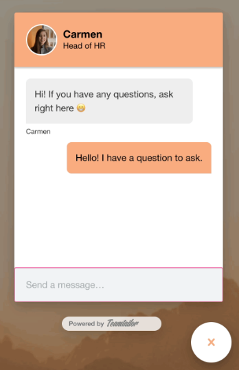Una función que podrías añadir a tu página de empleo es un chat. Un pequeño widget en una esquina, bajo tu total control, que permita a los candidatos contactarte si tienen alguna pregunta sobre el puesto antes de postularse. O quizá quieran aclarar alguna duda sobre tu empresa. Es un cambio mínimo y simple, pero con un gran impacto.