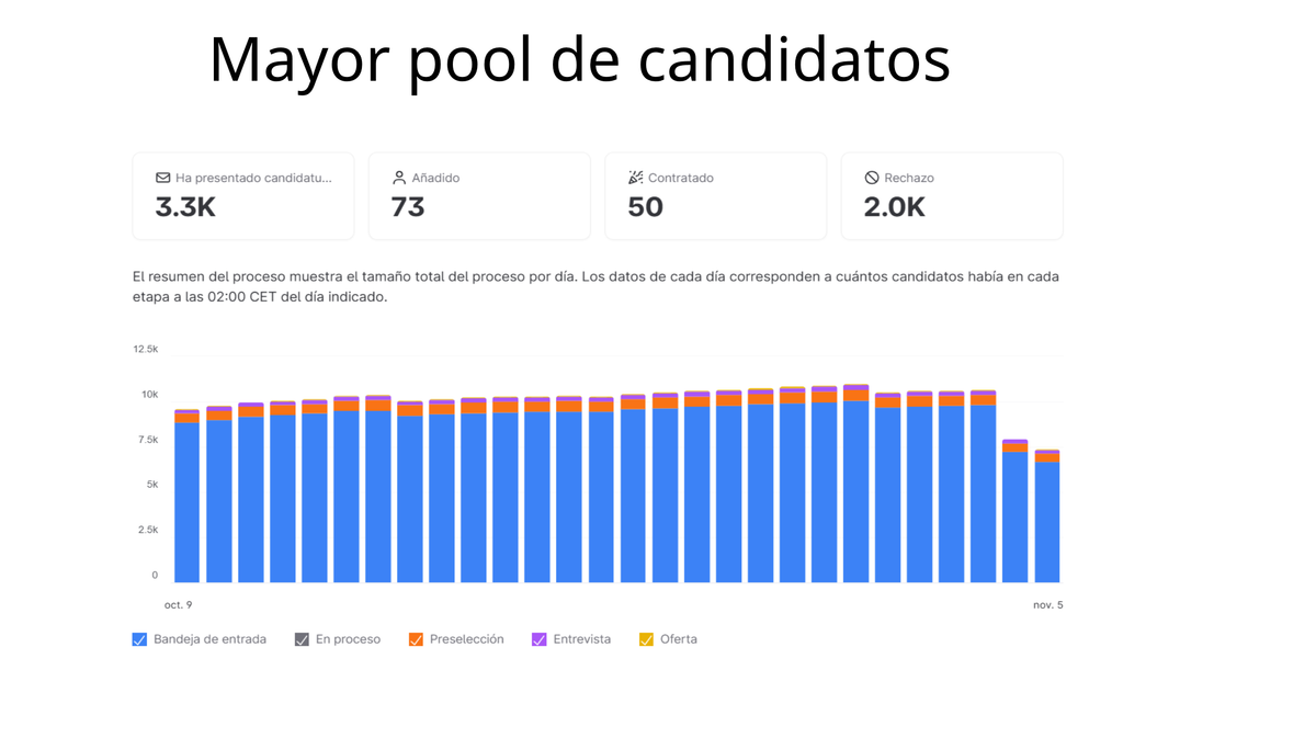 El gráfico de “Mayor pool de candidatos” muestra cómo, en un período breve, JDV–Santa Clara recibió más de 3,300 candidaturas, con 73 candidatos añadidos manualmente, 50 contrataciones y cerca de 2,000 rechazos, todo documentado de forma transparente.