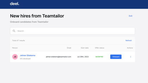 La integración permite la transferencia automática de datos clave de la persona contratada desde la plataforma de Teamtailor al módulo de onboarding de Deel. Con Teamtailor + Deel, podrá expandirse globalmente con una velocidad y flexibilidad inigualables, ofreciendo contratación global, gestión de RRHH y nóminas en un solo sistema.
